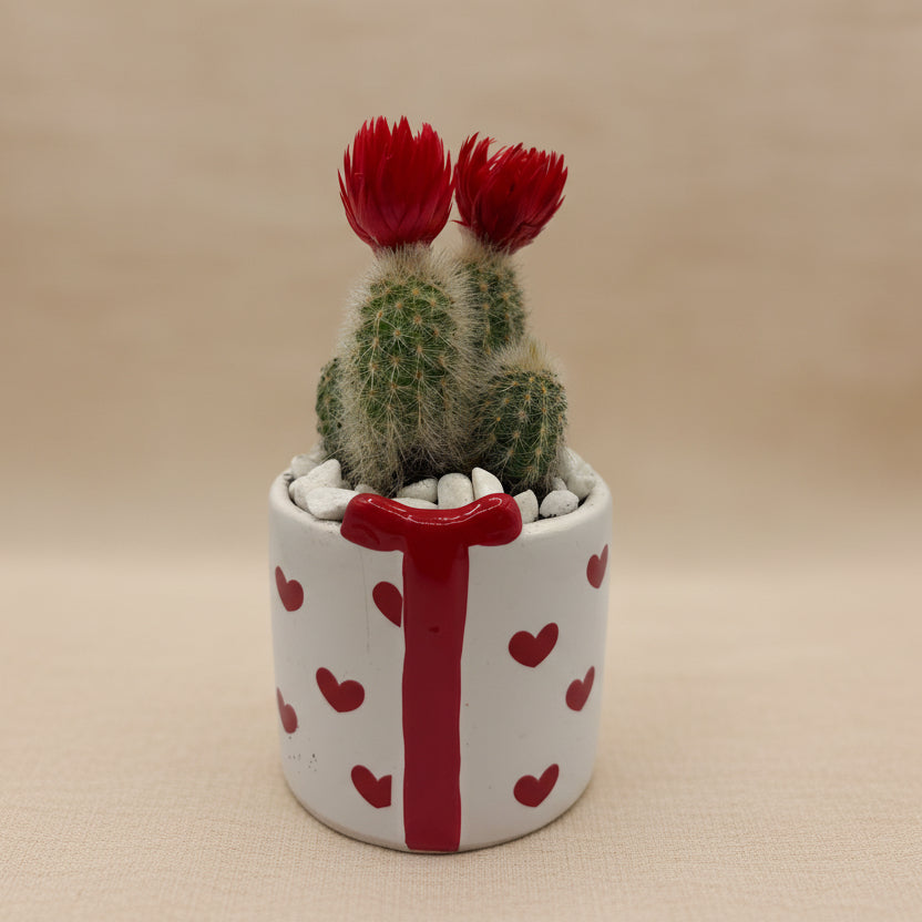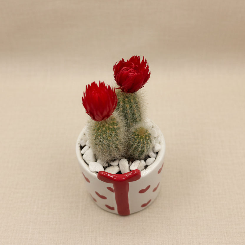 Un vaso in ceramica bianca decorato con cuoricini rossi e un fiocco centrale che lo rende un vero pacchetto regalo in miniatura. Dentro, una composizione di cactus che cattura lo sguardo e porta carattere a mensole e scrivanie.